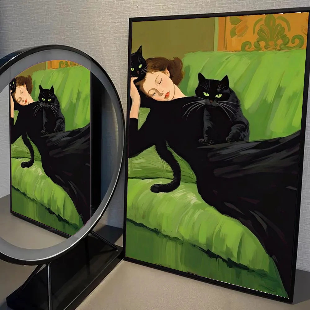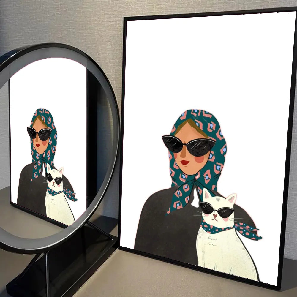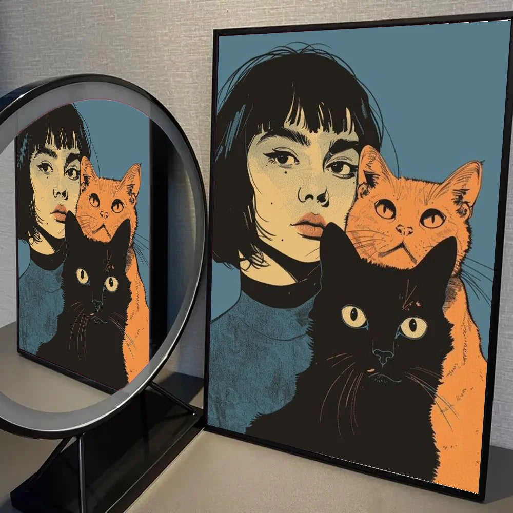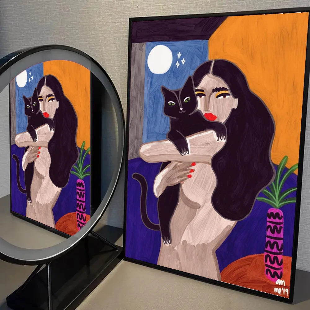 - Art Style: Abstract and modern composition featuring whimsical elements like a woman, bird, cat, fish, couple, and floral motifs.