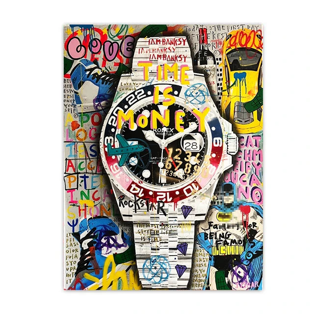 - Art Style: Bold pop art and street graffiti design with a motivational time-is-money theme.